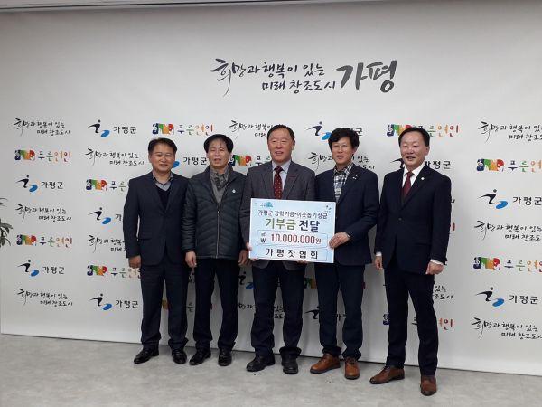 가평잣협회가 지난 10일 지역인재 육성 장학금 및 이웃돕기 성금 각 500만원씩 가평군에 기탁해 지역사회에 온기를 불어넣어주고 있다.