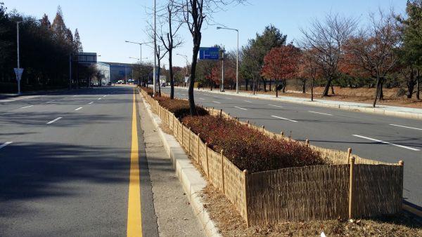 월동시설물 설치는 가로수 등 수목이 겨울철 도로변 제설작업 시 주로 사용되는 염화칼슘에 의한 피해를 최소화하고 방풍 및 보온효과를 얻기 위해 도로변 또는 중앙차로에 설치된 화단을 따라 왕골 등으로 만든 거적을 보호벽으로 설치하는 사업이다.