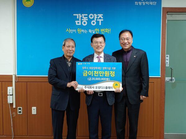 양주시 희망장학재단은 지난 10일 희망장학재단 사무국을 방문한 주식회사 오성디스플레이에서 2천만원을, 주식회사 커밍에서 1천만원의 장학금을 쾌척했다고 밝혔다.