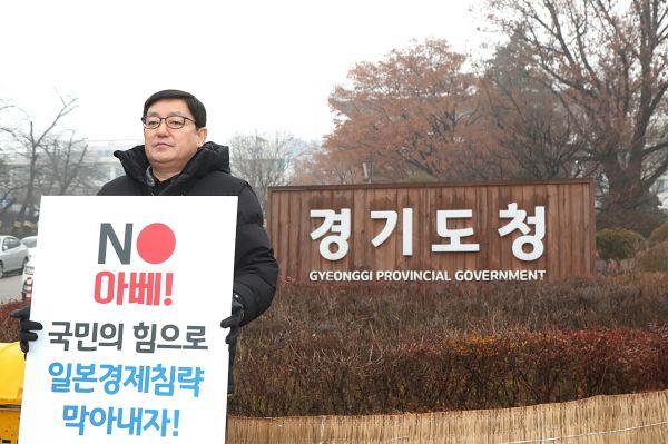 경기도청 앞에서 경기도의회 더불어민주당이 주관한 ‘일본 경제보복 철회 촉구 릴레이 1인 시위’에서 ‘NO 아베, 국민의 힘으로 일본경제침략 막아내자’라는 피켓을 들고 일본 경제보복의 부당성을 도민들에게 알렸다.