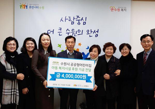 수원시 공공형 어린이집 연합회가 11일 시청 복지여성국장실에서 관내 아동복지시설 9개소에 후원금 400만원을 전달했다.