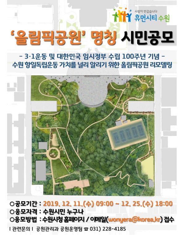 올림픽공원의 역사를 반영한, 부르기 쉬운 이름을 응모하면 된다. 수원시민 누구나 참여할 수 있고 1명이 1건을 응모할 수 있다.