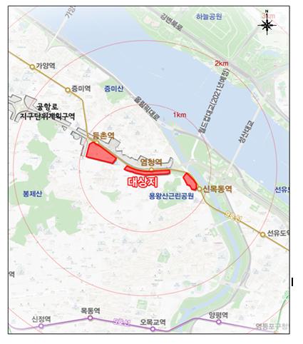 대상지는 공항대로 변을 따라 선형으로 이루어져 있으며 지하철 9호선 역사인 등촌역, 염창역, 신목동역 3개 역세권을 포함하고 있다.