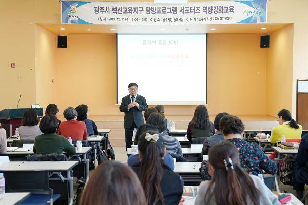 광주시 혁신교육협력지원센터는 지난 11일 시청 중회의실에서 진로코치단, 생태지도자, 지역학강사 등 마을활동가 50여명이 참석한 가운데 ‘광주시 혁신교육지구 탐방프로그램 서포터즈 역량강화 교육’을 실시했다.