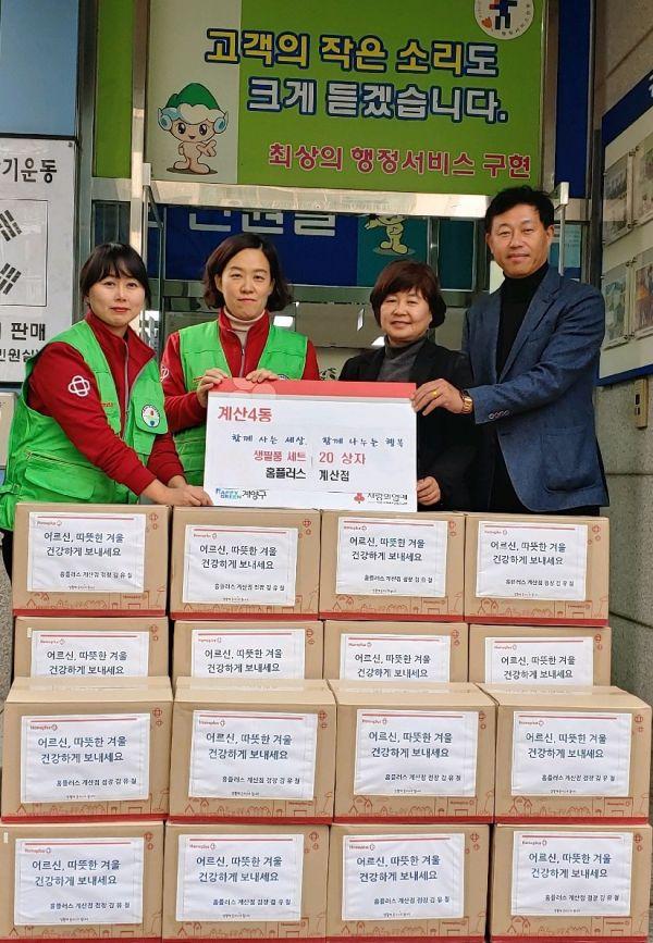 인천 계양구 홈플러스 계산점은 지난 10일 관내 어려운 이웃에게 도움이 되길 바란다며 100만원 상당의 생필품 세트 20상자를 계산4동 행정복지센터에 기탁했다.