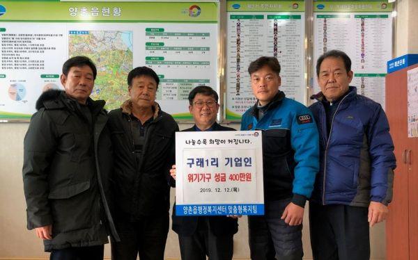 양촌읍 구래1리와 기성철강 등 구래리에서 기업을 운영하는 4명은 12일 양촌읍행정복지센터로 위기가정 지원을 위해 400만원의 성금을 기탁했다.