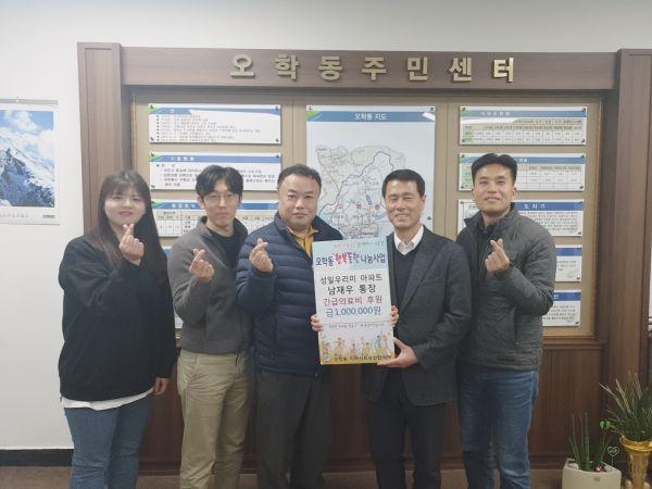지난 11일 오학동행정복지센터에서 성일우리미아파트 남재우 통장이 과중한 의료비 부담으로 어려운 형편에 있는 이웃을 위해 써 달라며 후원금 1,000,000원을 기탁했다.