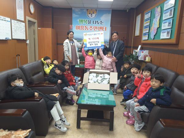 지난 11일 훈민어린이집 원아들이 여흥동 행정복지센터를 방문해 떡 100여 팩을 기탁했다.