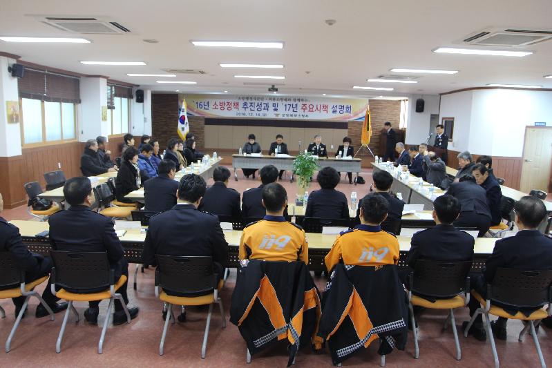 포항북부소방서(서장 오원석)는 16일 3층 대회의실에서 소방공무원 및 행정자문단, 의용소방대원 등 소방관계자 70여명이 참석한 가운데 2017년 추진할 주요시책들에 관한 설명회를 가졌다. 지진, 해일 등 재난발생시 현장대응을 위한 유기적인 협조체계 유지방안과 겨울철 화재예방을 위한 안전관리에 대한 사항을 중점적으로 논의되었다.
