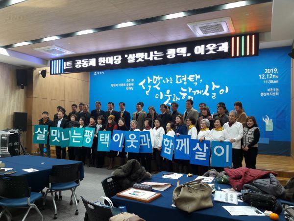 평택시가 12일 비전1동 행정복지센터에서 ‘2019 평택시 아파트 공동체 한마당’을 열고 ‘살맛나는 평택, 이웃과 함께살이’를 주제로 공동주택 공동체 활성화 시범사업 성과 공유회를 가졌다.