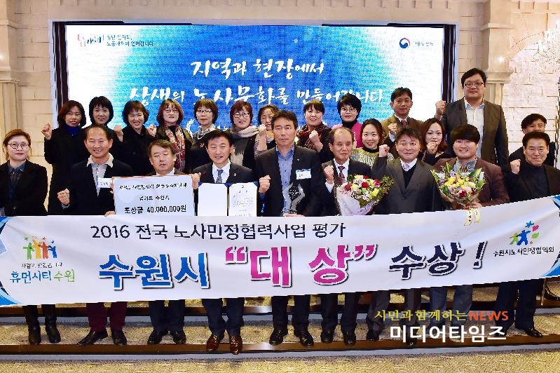 [미디어타임즈= 신정식 기자] 수원시는 지난 15일 오후 3시 CCMM(여의도 국민일보빌딩)에서 열린 고용노동부 주관 ‘2016년 지역 노사민정 협력 활성화사업 시상식’에서 기초자치단체 부문 대상을 수상했다.