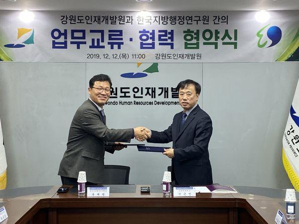 강원도인재개발원과 한국지방행정연구원은 12일 인재개발원에서 지방자치 발전을 선도하는 우수한 지역인재 양성에 상호 협력하는 내용을 담은 업무협약을 체결했다.