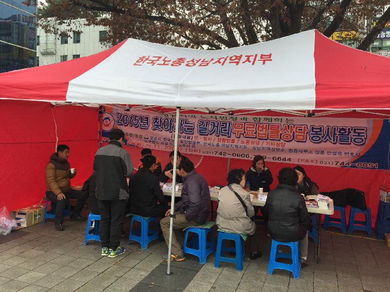 한국노총 성남지역지부는 길거리 법률 상담소와 노동교육상담소(☎031-742-0606. 중원구 순환로 166 근로자종합복지관) 운영을 11년째 병행해 지난해에만 1800건의 무료 상담을 했다.