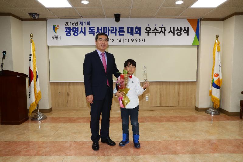 | 14일 광명시 독서마라톤 대회에서 어린이 단축코스 우수자로 선정된 이정민 어린이가 양기대 광명시장과 기념촬영을 하고있다. <사진=광명시청 제공> |