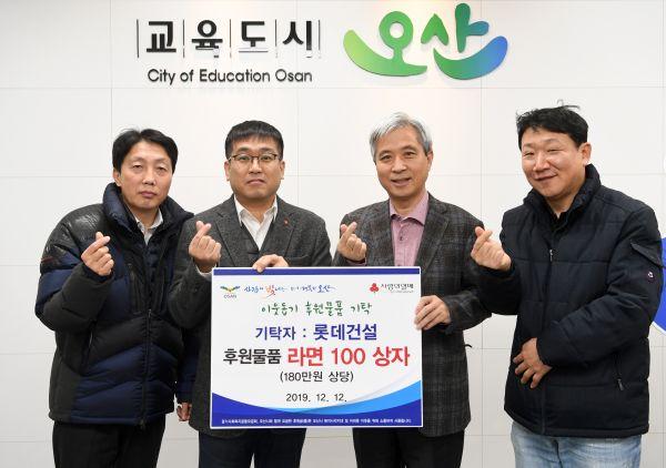 오산시(시장 곽상욱)는 지난 12일 롯데건설(인재개발원 오산캠퍼스 리빌딩 현장사무소)에서 관내 어려운 이웃을 위해 180만원 상당의 라면 100박스를 전달했다고 밝혔다.