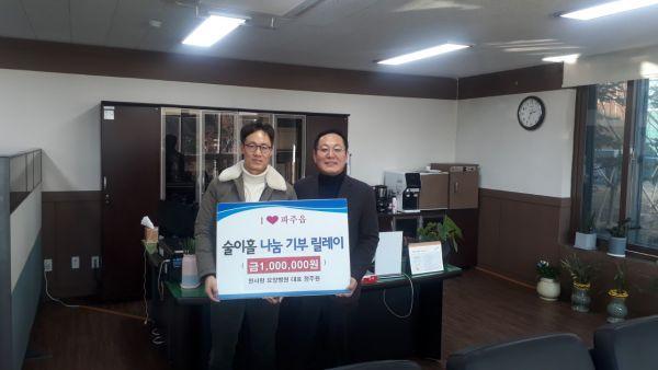 파주시 파주읍은 지난 12일 한사랑 요양병원이 ‘술이홀 나눔 기부릴레이’에 참여해 성금 100만원을 기탁했다고 밝혔다.