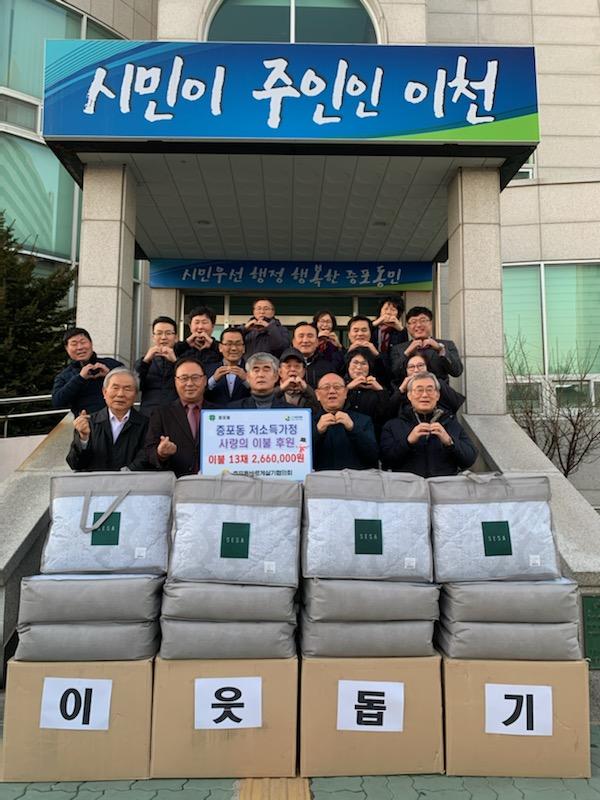 이천시 증포동 바르게살기위원회는 지난 12일 날로 추워지는 겨울을 맞아 증포동 관내 저소득계층에게 전달해달라며 이불 13채를 증포동행정복지센터에 기탁했다.