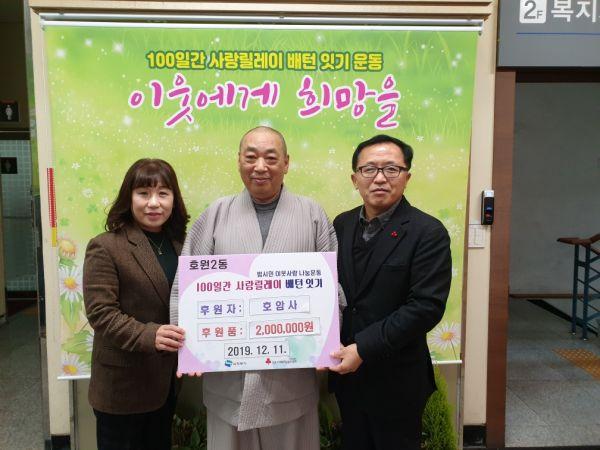 의정부시 호원2동에 위치한 호암사는 지난 11일 호원2동 행정복지센터를 방문해 관내 저소득층 가정을 위한 후원금 200만원을 기탁했다.