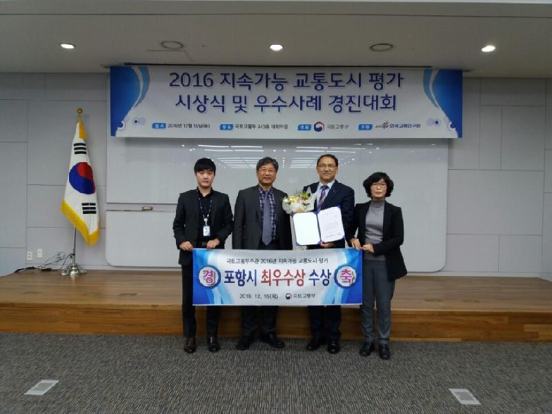 포항시가 국토교통부 주관하는 2016년도 지속가능 교통도시 평가에서 최우수 기관으로 선정돼 기관표창과 함께 시상금 5,000만원을 수상하는 영예를 안았다. 지속가능 교통도시 평가는 전국 인구 10만 이상 74개 지자체를 대상으로주차 수요관리를 위한 노력과 교통 약자를 위한 정책적 노력, 교통안전 개선 등 교통 환경, 사회, 경제적 부문의 12개 항목 32개 지표에 대해 실시됐다. 포항시는 지금까지 교통약자 및 교통환경 개선에 힘써왔으며 특히 이번 평가에는 ‣운전자들의 안전 운전 유도를 위한 차로 유도선 설치 ‣관광지 및 상가 밀집지역 주차장 설치 ‣치매․고령운전자 운전면허증 반납 컨설팅 추진 ‣찾아가는 교통안전교육 ‣어린이 교통랜드 안전 교육 실시 ‣고원식 횡단보도 설치 ‣횡단보도 LED 안전등 설치 ‣교통 약자를 위한 보행자 개선지구 사업 ‣주차난 해소를 위한 주택가 공한지 이용 주차장 설치 ‣벽지거주 노인들을 위한 행복택시 운영 등 연계 교통망 구축 노력에 힘입어 전 항목에서 고르게 높은 점수를 받아 최우수상을 수상했다. 김무장 교통지원과장은 “이번 수상을 계기로 앞으로도 시민들을 위한 안전하고 쾌적한 교통 시설물을 점검하고 실천해 나감으로서 시민 모두가 만족하는 선진 교통 문화 정착에 최선을 다하겠다”고 말했다. 한편 국토교통부에서는 2014년부터 각 지역의 지속가능 교통도시를 평가함으로써 지역의 교통 환경 조성, 걷기 쉬운 거리등을 개선해 나가는데 중점을 두고 합리적인 교통전략 수립 및 지속가능한 교통기반 조성을 위해 매년 평가를 시행하고 있다.
