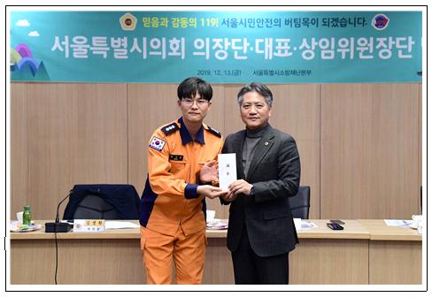 서울특별시 소방재난본부에서는 시민의 생명과 안전을 지키기 위해 수고하고 있는 소방공무원들에 대한 격려금을 전달하고 향후 소방공무원들의 처우 및 근무여건 개선을 위해 서울시의회도 지속적인 노력을 기울일 것을 약속했다.