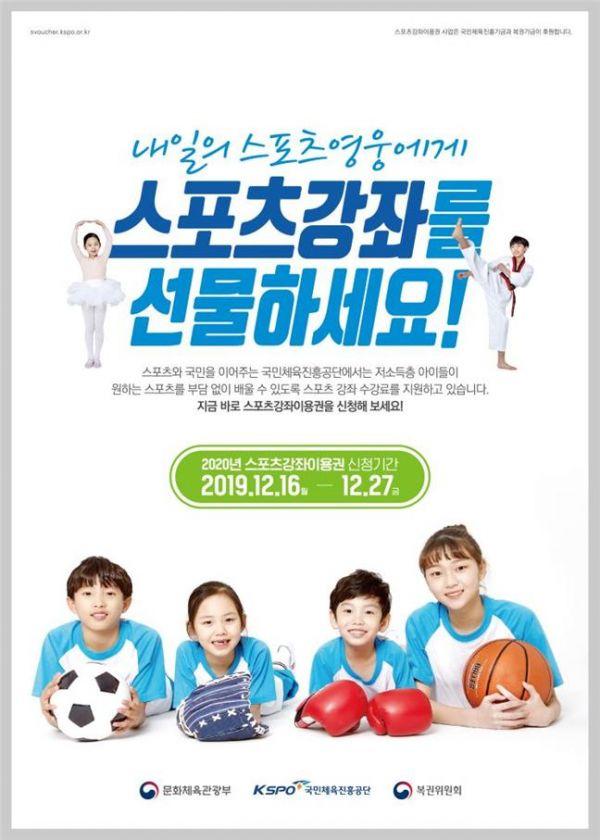 저소득층 유·청소년에게 월 8만원 범위 내에서 스포츠 강좌 수강료를 지원하는 ‘2020년 스포츠강좌이용권’ 사업이 16일부터 27일까지 신청자를 모집한다.