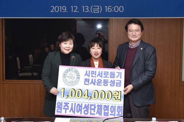 원주시 여성단체협의회는 지난 13일 원주시청 7층 회의실에서 시민서로돕기 천사운동 후원금 1,004,000원을 원주시에 전달했다.