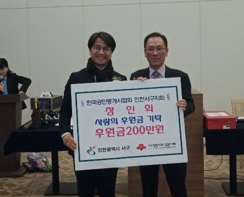 한국공인중개사협회 인천서구지회 장인회는 관내 어려운 이웃들에게 전달해달라며 사랑의 후원금 200만원의 전달식을 지난 12일 인천아시아드주경기장에서 진행했다.