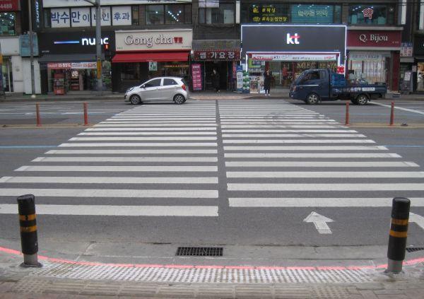 바닥형 보행신호등은 횡단보도 양끝 바닥에 LED등을 매립해 기존 보행등과 연동시켜 흐린 날 또는 야간에 차량 운전자들에게는 시인성을 높여주고 보행자들에게 추가적인 신호 정보를 제공하는 보행신호등 보조 장치이다.
