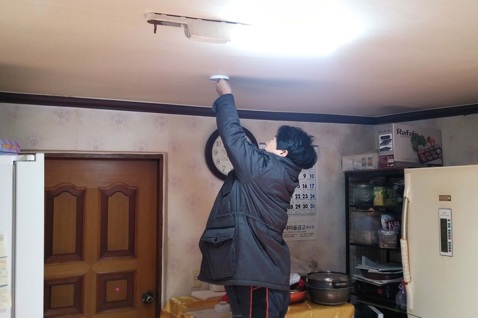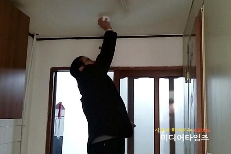 | 만석동 일대 화재예방 단독경보형 감지기 설치를 하고 있다. <ⓒ미디어타임즈> |