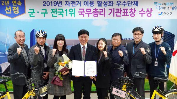 연수구가 ‘2019년 자전거 이용활성화 우수단체 공모에 참여한 결과 2년연속 우수기관으로 선정돼 군·구 전국 1위인 국무총리 기관표창을 받았다.