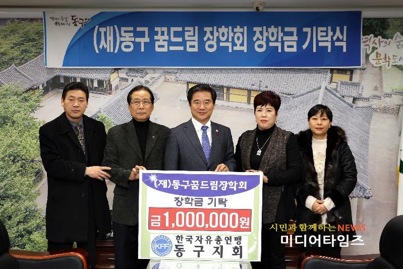 [미디어타임즈=문상수 기자] 인천 동구(구청장 이흥수)는 22일 한국자유총연맹 동구지회(회장 허인복)가 꿈드림장학금 100만원을 기탁했다.구에 따르면 이날 전달된 장학금은 한국자유총연맹 동구지회가 지난 10월 개최한 ‘이웃사랑 행복나눔 다과회’ 수익금으로 마련한 것으로, 동구 학생들의 꿈과 교육발전 응원에 뜻을 함께 했다.기탁식에 참석한 김송준 자유총연맹동구지회협의회장은 “동구의 미래인 자라나는 꿈나무들을 위해 관내 자생단체로서 장학금 기탁에 회원들의 뜻을 모았다”며 “학생들이 각자의 꿈과 희망을 펼쳐나가는 데 작은 보탬이 되길 바란다”고 말했다.이흥수 동구청장은 “장학금을 기탁해 준 한국자유총연맹 동구지회 관계자외 회원 여러분께 감사드린다”며 “소중한 정성들이 학생들의 희망 가득한 꿈을 이루는 데 소중히 쓰일 수 있도록 하겠다”고 말했다.한편 (재)동구꿈드림장학회는 신규 장학 사업으로 지난달 29일 공고를 통해 ‘2017년 근로장학생’을 선발한다. 신청접수는 12월 26일부터 30일까지로, 공고일(12월 9일)을 기준으로 학생 본인 또는 보호자가 동구에 1년 이상 실제 거주하고, 직전학기 평점 3.0이상(4.5기준)인 대학교 재(휴)학생(2017학년도 1학기 기준 2, 3, 4학년)이 대상이다. 자세한 사항은 동구청 홈페이지 공지사항을 참고하거나 동구청 평생교육과(☎032-770-6088)로 문의하면 된다.