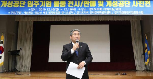 송한준 경기도의회 의장이 16일 ‘개성공단 입주기업 물품 전시·판매 및 개성공단 사진전’ 개막식에서 개성공단 재개의 희망을 도내 입주기업들과 함께 키워나가겠다고 밝혔다.