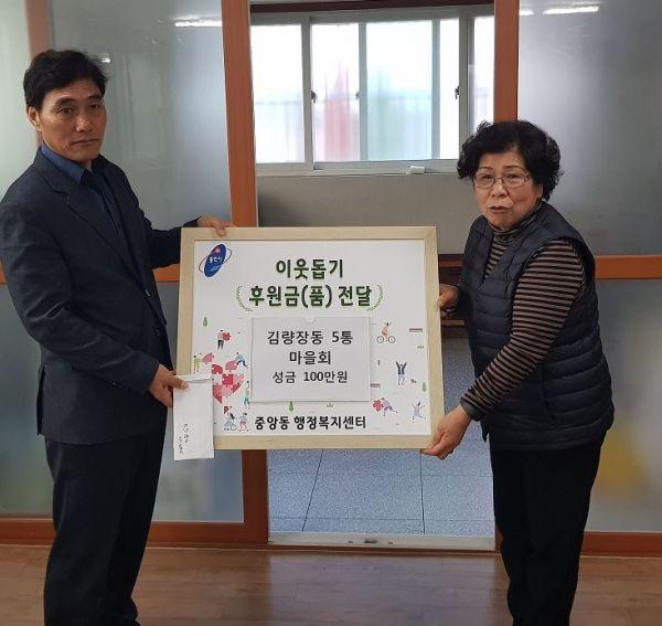 중앙동에선 김량장5통 마을회가 대동회에 참석한 주민들이 모은 이웃돕기 성금 100만원을 기탁했다. 김량장5통 마을회는 2018년에도 100만원의 이웃돕기 성금을 기탁한 바 있다.