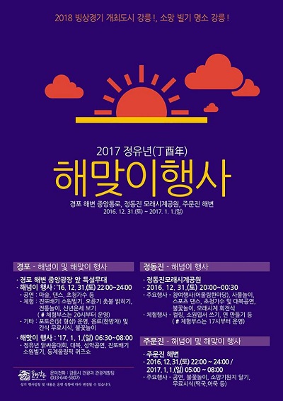 이 외에도 주문진해변에서는 문화공연, 불꽃놀이로 구성된 해넘이·해맞이 행사, 강남동 모산봉에서는 새해제례행사와 더불어 소원빌기 행사, 옥계해변에서도 새해소망을 기원하는 떡국나눔 행사가 열린다.
