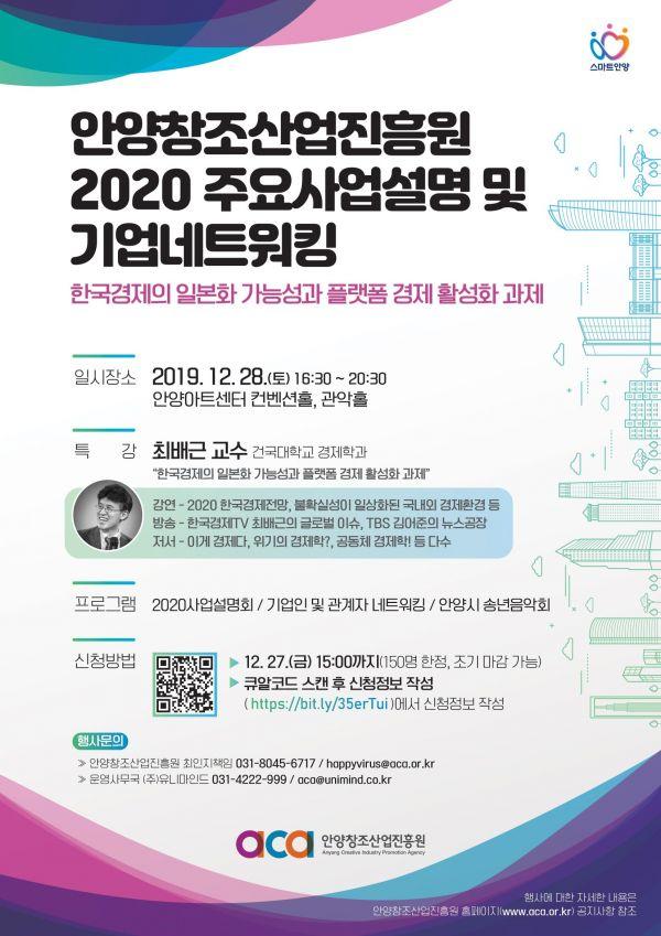 안양창조산업진흥원에서 주관하는 이번 설명회는 2020년 지원사업 설명 최배근 교수의 경제 특강 만찬 및 음악회 네트워킹 등이 진행된다.