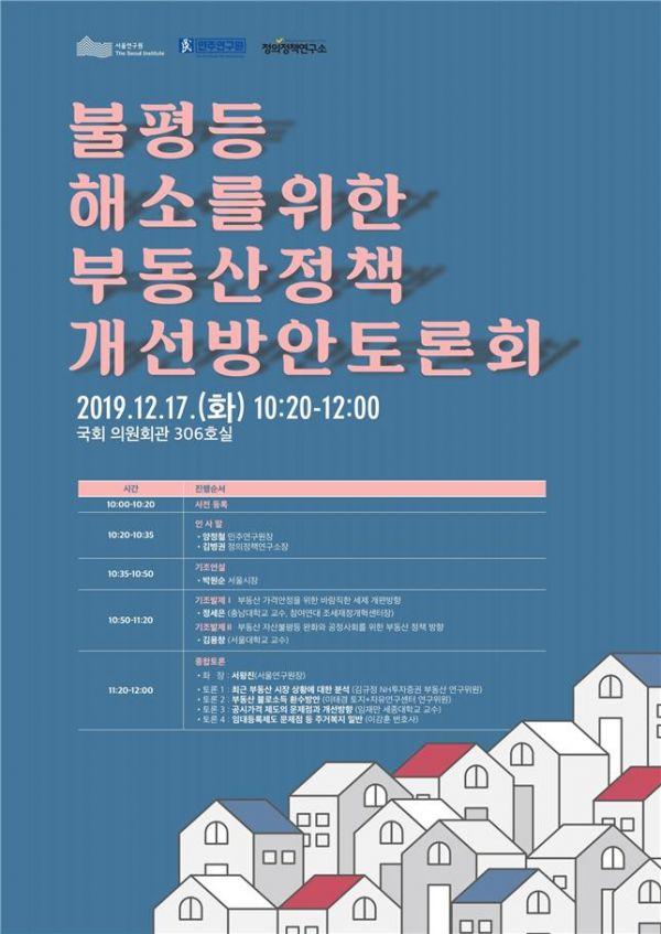 발제가 끝난 뒤에는 서왕진 서울연구장을 좌장으로 각계 전문가가 참석하는 부동산 정책 제도개선 방안에 대한 토론이 이어진다. 토론자로는 김규정 NH토자증권 부동산 연구위원 이태경 토지 자유연구센터 센터장 임재만 세종대학교 교수 이강훈 변호사가 참여해, 최근 부동산 시장 상황에 대한 분석, 부동산 불로소득 환수방안, 공시가격 제도의 문제점과 개선방향에 대해 공유하고 앞으로의 방향을 제시할 예정이다.