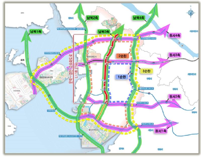 * 남북 4축 : 인천대교, 제2외곽고속도로, 제1경인고속도로, 제1외곽순환고속도로