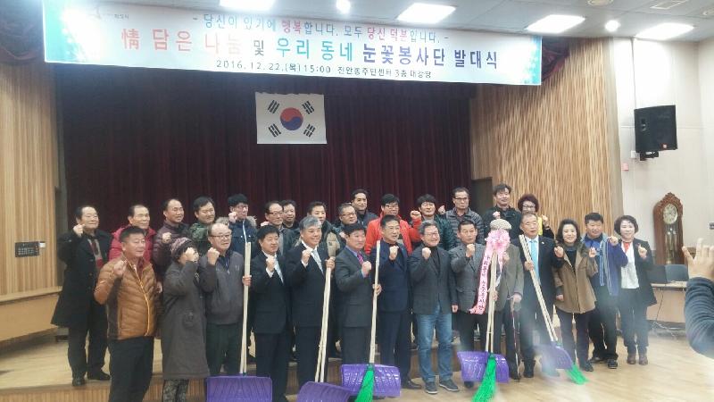 발대식에는 채인석 화성시장을 비롯해 진안동 사회단체협의회, 주민자치위원회와 주민 등 100여 명이 참석했으며, 사업 소개와 결의선언, 제설장비 전달 등이 진행됐다.
