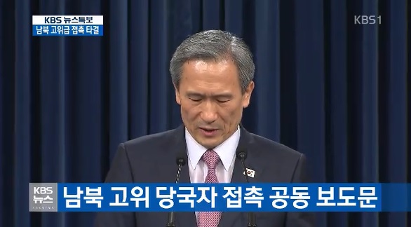 | 김관진 국가안보실장이 25일 새벽 02시경 청와대 춘추관에서 남북 고위 당국자회담 결과를 발표하고 있다.(사진= kbs 사진 캡쳐) |