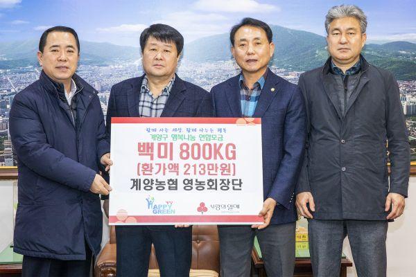 인천 계양농협 영농회장단는 지난 16일 연말연시 이웃돕기 성품으로 백미 10㎏ 80포를 계양구에 기탁했다.