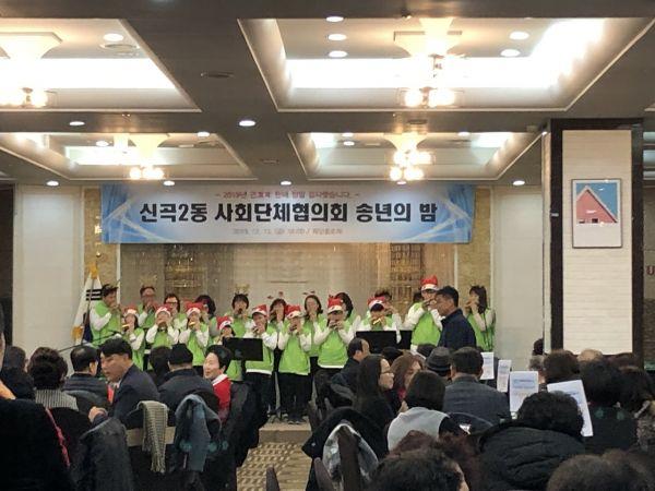 주민자치위원의 진행으로 시작된 합동송년회는 신곡2동 청소년지도협의회 회원 및 관내 청소년들의 아름다운 오카리나 합주를 시작으로 신곡2동 12개 단체에서 헌신적으로 봉사하신 회원에게 감사패 전달, 신곡2동 새마을지도자회 회장의 사회로 노래자랑 등이 펼쳐져 화기애애한 분위기 속 한 해를 마무리하는 뜻깊은 행사가 진행됐다.