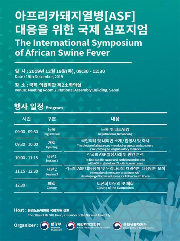 환경부는 국회 환경노동위원회 설훈 의원실과 함께 오는 19일 오전 9시 30분부터 서울 영등포구 국회의원회관 제2소회의실에서 ‘아프리카돼지열병 대응을 위한 국제 토론회’를 개최한다.