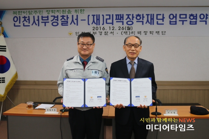 [미디어타임즈=김동일 기자] 인천서부경찰서(서장 조은수)는 지난 26일 경찰서 소회의실에서 서장, 정보보안과장, (재)리팩장학재단 이일해 이사장 및 북한이탈주민 15명이 참석한 가운데 탈북민 장학지원을 위한 서부서‧(재)리팩장학재단 간 업무협약식을 갖고 장학증서 전달하는 행사를 가졌다.(재)리팩장학재단(이사장 이일해)은 금년 설립한 장학재단으로 관내 불우청소년 및 소외계층의 장학사업을 추진 중, 경제적 어려움에 처해있는 탈북민들을 위해 서부경찰서와 (재)리팩장학재단이 뜻을 모아 업무협약식을 갖게 되었다. 이 이사장은 “경제적인 어려운 환경때문에 학업을 중단하는 일은 없었으면 한다며 이번 장학지원(1,000만원)이 조금이나마 보탬이 되었으면 하는 바램”이고 향후 지속적인 장학지원 활동을 약속하였다.조 서장은 “이런 뜻깊은 사업을 하시는 재단 이사장님께 진심으로 감사하며, 장학사업을 통해 남한에 정착중인 탈북민들이 학업에 정진하여 우리 사회에 공헌 할 수 있기 바란다”고 말했다. 이 자리에 참석한 탈북청소년 정○○(여, 고교1년)는 “항상 공부를 하면서 힘들게 아르바이트를 하시는 어머니께 미안했는데 이번 장학금을 계기로 더욱 열심히 공부해서 사회에 필요한 일꾼이 되겠다”며 고마움을 표시했다.