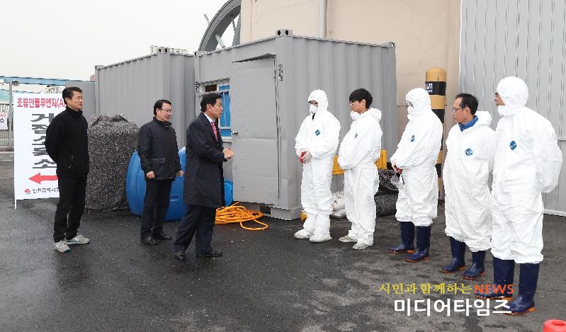[미디어타임즈=문상수 기자] 김홍섭 중구청장은 지난 26일 관내 AI 거점 소독소를 방문하여 추운 날씨에 방역현장에서 고생하는 근무자들을 격려하고, AI 방역에 만전을 기해달라고 당부했다.중구는 전라남도에서 발생된 AI가 전국적으로 확산, 인근지역인 경기도 김포에서 AI가 발생함에 따라 2016년 12월 16일부터 재난안전대책본부를 구성(본부장 : 구청장)하고, 거점 소독소 3개소를 설치‧운영하여 관내의 가금류 사육농가의 축산차량 이동에 따른 AI 유입을 차단을 위해 소독을 실시하고 있다.중구에서는 사료공장 6개소와 사료운반차량 100여대를 관리하고 있으며, 출발지와 도착지의 거점 소독소에서 소독필증을 발급받아야 축산관계시설에 출입이 가능하다.영종 용유지역에서는 44개 농가에서 1만 3천여마리의 가금류가 사육되고 있는 것으로 파악되고 있어, 농가 소독방역 지원을 위한 소독약, 생석회를 공급하는 등 거점 소독소 운영과 함께 AI 유입차단 및 예방에 만전을 기하고 있다.구 관계자는 이를 위해 중구청 전 공무원들이 거점 소독소 근무 지원에 나서며, 소독소의 24시간 운영으로 AI의 관내 유입 차단에 최선을 다하고 있다고 전했다.