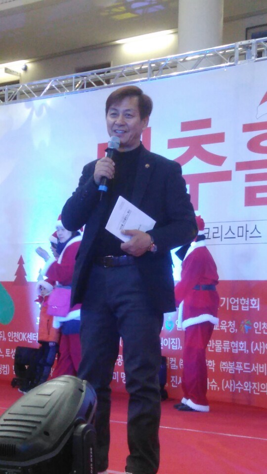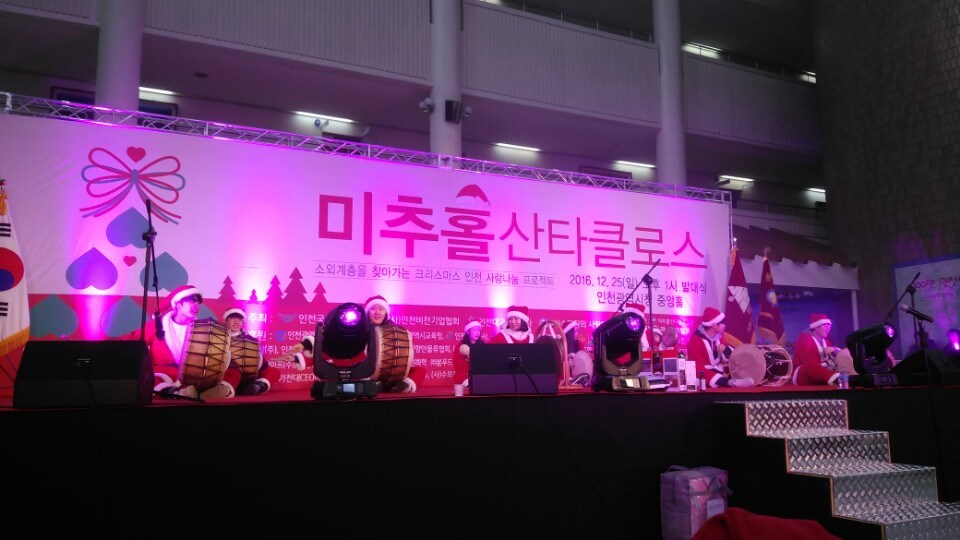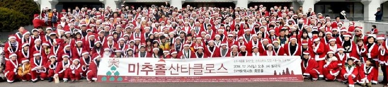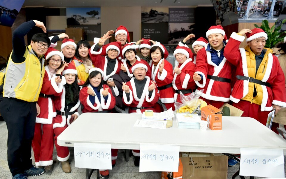 | 2016년 제7회 수&진 사랑더하기 행복한 미추홀 산타클로스 봉사자들이 시청앞마당에서 기념촬영을 하고있다. <ⓒ미디어타임즈> |