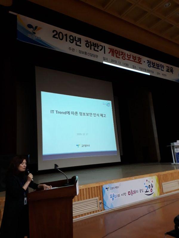 이날 교육은 고양시 직원을 대상으로 개인정보보호법 주요 내용 및 위반사례 정보보안 규정 및 정보보호의 생활화 최근 IT 트랜드와 정보보호 시사점 등에 대해 알아보는 시간으로 이뤄졌다.