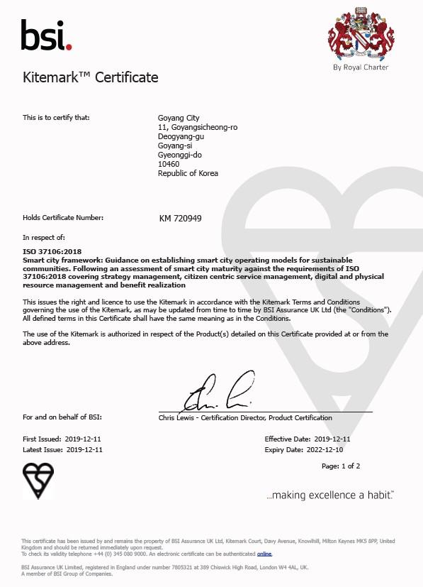 ‘스마트시티 국제인증’은 전 세계의 스마트시티 표준화 및 지속가능한 도시 건설을 위해 세계표준화기구가 2018년 7월에 제정한 스마트시티 국제표준이다. 평가지표는 디지털 및 도시정보의 활용노력, 시민의 참여도, 도시운영관리 및 대시민 서비스 수준 등으로 구성되는데, 고양시는 지난 10여 년간 추진해왔던 스마트시티 운영경험을 토대로 스마트시티 국제인증 심사를 높은 점수로 통과했다.