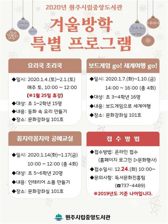 원주시립중앙도서관이 겨울방학을 맞아 어린이와 청소년의 도서관 이용 생활화를 위해 겨울방학 특별 프로그램을 운영한다.
