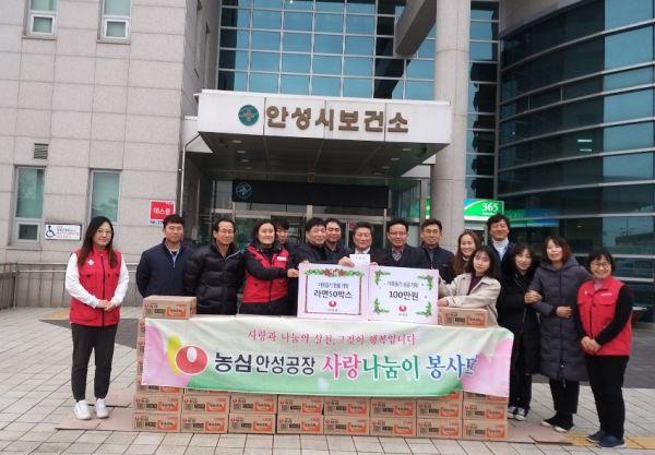 안성시 보건소는 지난 17일 ㈜농심 안성공장 임직원들이 연말에 홀로사는 어르신과 소외계층을 위해 성금 100만원과 라면 50박스를 기탁했다고 밝혔다.