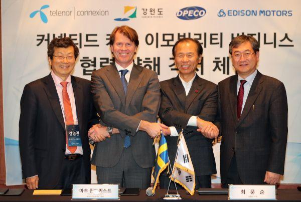 강원도는 ㈜디피코, 에디슨모터스와 함께 세계 최대 모바일 네트워크 사업자 중 하나인 텔레노어 커넥션과 “강원도 전기자동차 산업의 글로벌 진출을 위한 업무협약”를 체결했다고 지난 17일 밝혔다.